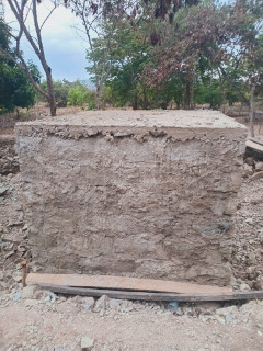 | Beginn der Aushub-Arbeiten im Frühjahr 2025 | Bisher trockenes Feld, welches mitbewässert werden soll. | Neuer Trinkwasserbrunnen im kenianischen Hochland: Rohbau Stand Ende Oktober 2025. | Sockel für künftigen Wassertank. |